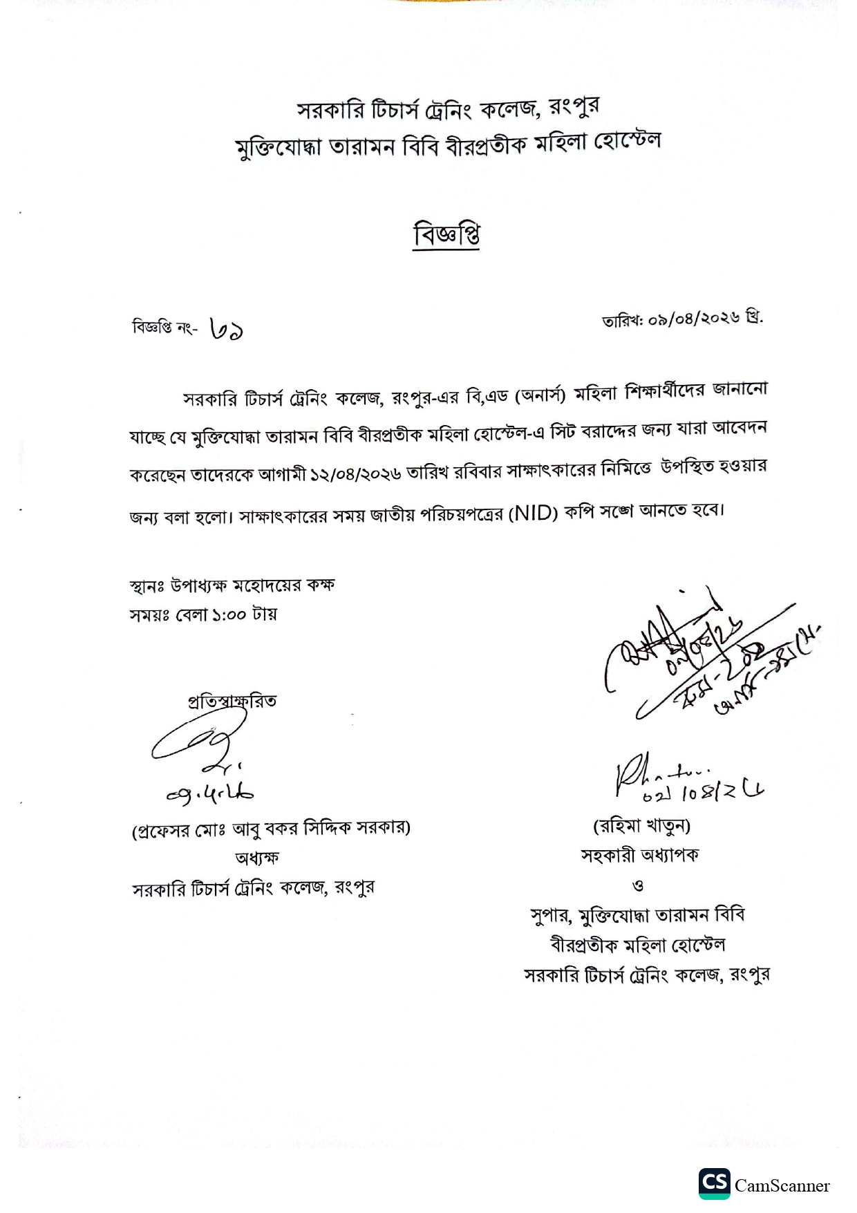 মহিলা হোস্টেলের সাক্ষাৎকার গ্রহণ সংক্রান্ত বিজ্ঞপ্তি